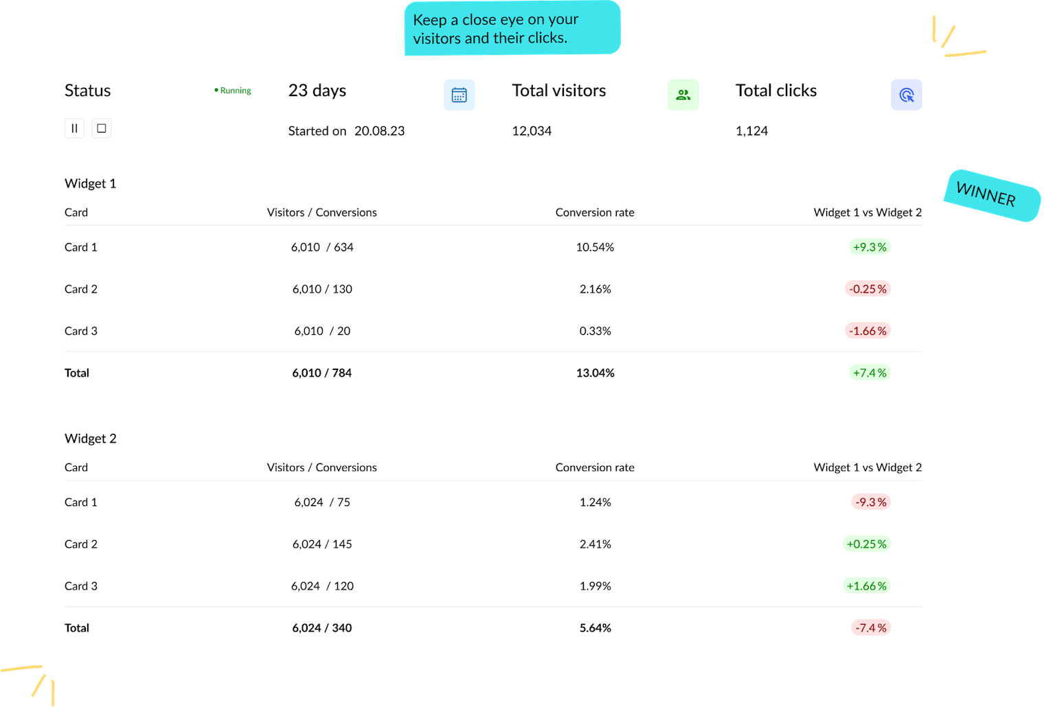Increase your conversion rates with A/B testing. Create two pricing table options, run A/B tests, and see which one brings in more customers.