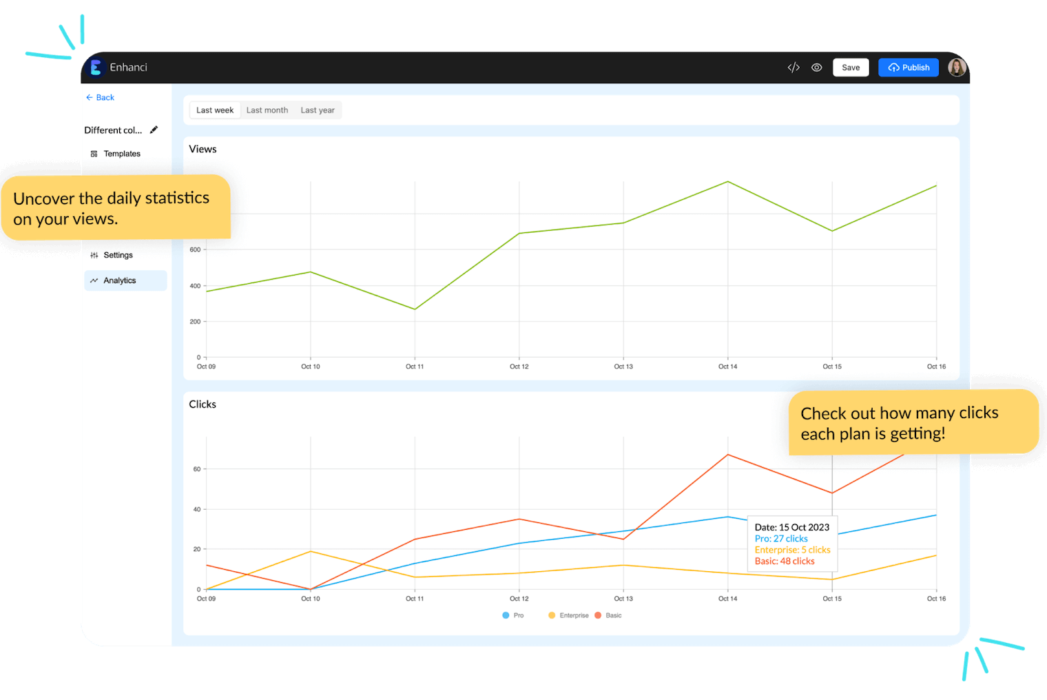Track the number of clicks on specific pricing plan options and total views easily with our analytics tool. Integrate with Google Analytics to access the data within your account.